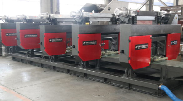 W-600金屬帶鋸床是一款根據(jù)客戶要求定制的非標帶鋸床,其采用臥式橫切結(jié)構(gòu),是在工業(yè)鋸切中用于水平鋸切纖維板的設(shè)備。W-600帶鋸床的五個機頭之間的距離是經(jīng)過科學(xué)測量好的標準距離,很好的實現(xiàn)了一塊纖維板同時鋸切成五片薄片的過程,且采用傳送帶傳送工件,提高了鋸切效率和鋸切精度,是批量下料的理想設(shè)備。