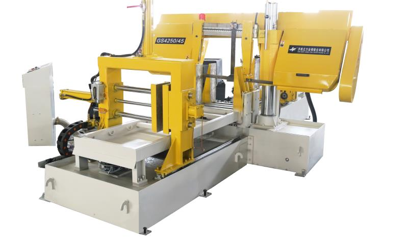 以我司為客戶定制打造的龍門式GS500雙鉗雙壓、前后送料1.2m數(shù)控帶鋸床舉例,如上圖所示,此鋸床采用了兩組自動送料裝置(進料、出料側(cè)各一組),進料側(cè)虎鉗夾緊向前送料,單次最大行程為1.2m,如不能滿足所需長度,則由出料側(cè)送料機構(gòu)夾緊工件往前拉料,單次型材為1.2m,輥輪為自由輥道,送料機構(gòu)由液壓驅(qū)動,長度采用光柵尺檢測,可以多次重復送料。在鋸床的送料虎鉗座后方安裝光幕開關(guān),可檢測送料,在檢測不到材料時說明需要重新上料,觸摸屏上顯示無料。此定制鋸床的鋸架根據(jù)客戶需求特殊設(shè)計,鋸輪左右輪傾斜2-3°,滿足客戶對型鋼類材料的鋸切需求,防止型鋼卡鋸,客戶對此鋸床的使用體驗給與了優(yōu)異反饋。