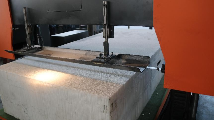 泡沫鋁是超輕純金屬材料,主要在于打造鋸床合適的鋸切范圍、靈活的工作臺、合理的固定裝置以及為客戶設計正確的鋸床切割參數(shù),使帶鋸床達到穩(wěn)定的鋸切效果,保障不對材料切割表面造成損耗。客戶所需切割的發(fā)泡鋁面積大,而對承重要求不高,因此適合使用具有高承載面積的數(shù)控臥式結構帶鋸床。