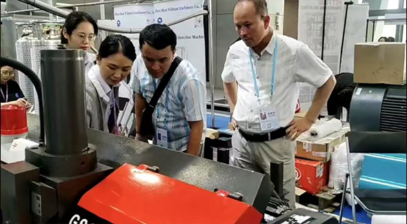 在本次展會(huì)上,金鋒鋸業(yè)展出了公司的“拳頭產(chǎn)品”—GS260數(shù)控帶鋸床。此設(shè)備采用PLC控制系統(tǒng),可設(shè)置一組或幾組數(shù)據(jù)連續(xù)切割,精度高、切割快。彩色觸摸屏設(shè)置,新手可快速上手。此鋸床一經(jīng)展出,便吸引不少中外客戶前來參觀咨詢,市場部熱情細(xì)致的講解引得連連贊嘆,紛紛表示對金鋒帶鋸床產(chǎn)生了濃厚的興趣。